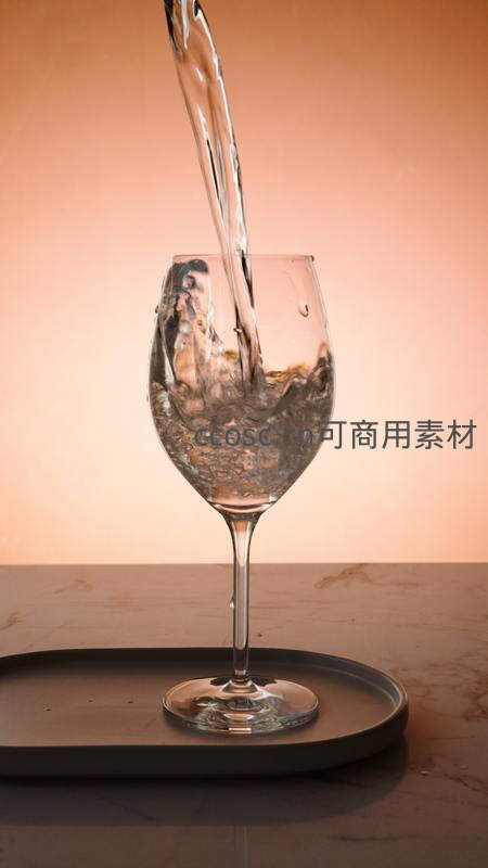 在温暖柔和的光线下,清澈水流正注入一只精致的高脚酒杯,水花翻腾,展现液体流动的优雅与生活的仪式感。