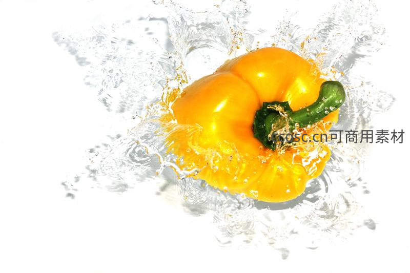 一颗鲜亮的黄椒坠入水中,激起四散的水花,凸显其新鲜饱满,充满视觉冲击力。
