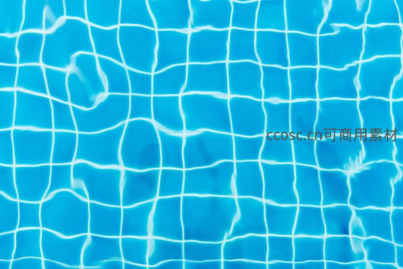 清澈的蓝色泳池水面上,阳光透过形成扭曲的白色网格倒影,营造出清凉宁静的夏日氛围。