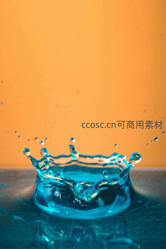 一颗水滴撞击蓝色水面,在暖橙色背景衬托下,溅起如皇冠般精致的水花,充满活力与艺术感。