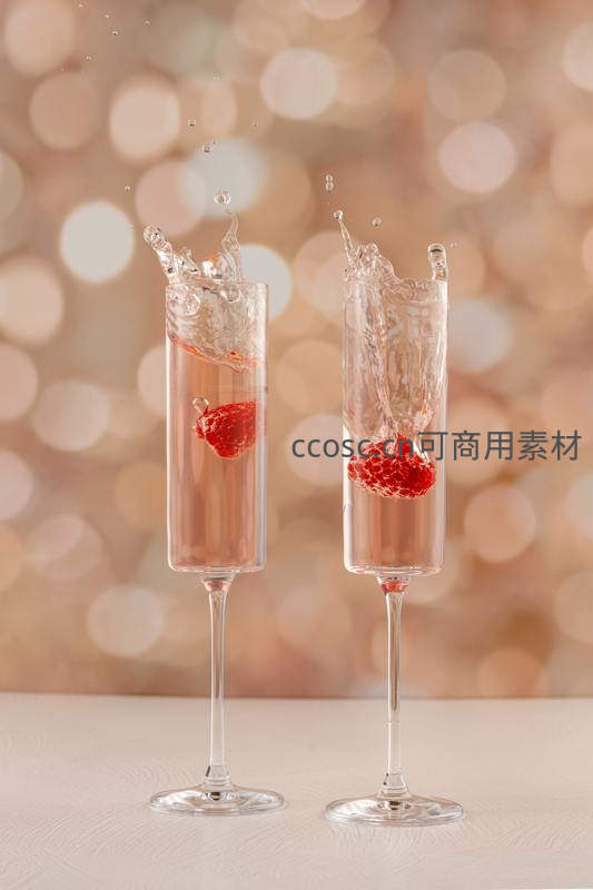 两颗鲜红覆盆子同时落入装有粉红气泡酒的香槟杯中,水花飞溅,背景是温暖梦幻的光斑,充满节日庆典的浪漫气息。