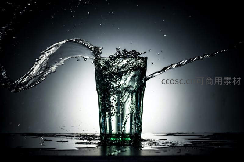 在深色背景下,一杯水被剧烈搅动,水流如两条巨龙般向两侧喷射,水珠四散,展现出强大的视觉张力和能量感。