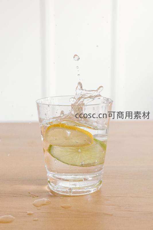透明玻璃杯中,柠檬与青柠片在清澈水中激起晶莹水花,木桌背景衬托出清爽自然的夏日氛围。