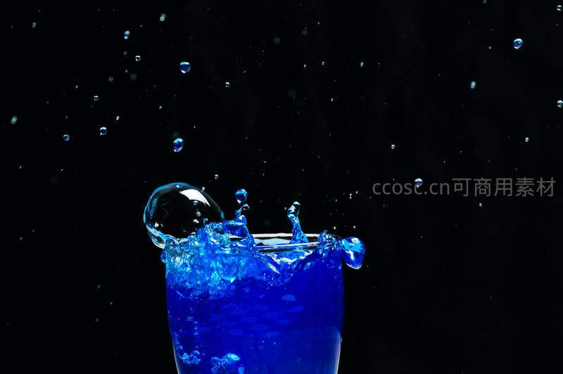 深邃黑色背景下,一杯鲜艳的蓝色液体正猛烈飞溅,晶莹的水珠和气泡凝固在空中,充满未来感与视觉冲击力。