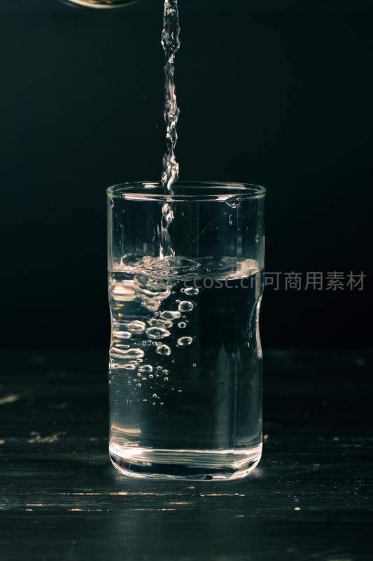 清澈水流从上方注入透明玻璃杯,水面泛起涟漪与气泡,深色背景凸显了水的纯净与流动的优雅姿态。