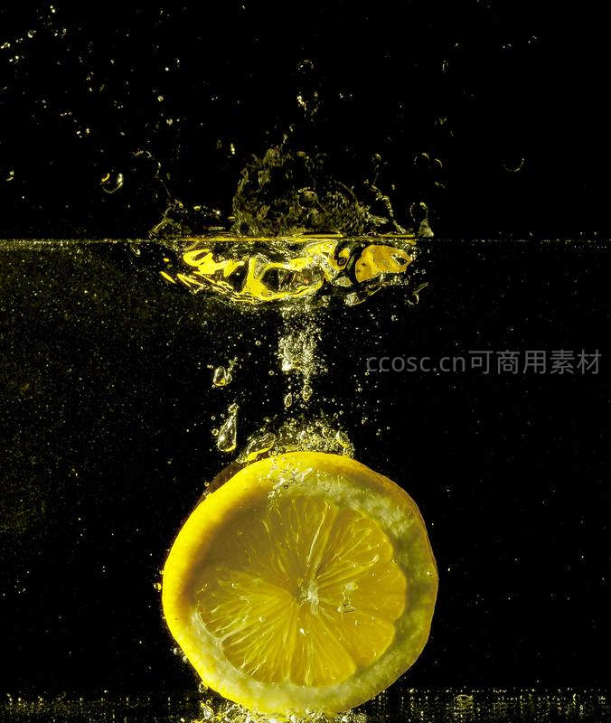 柠檬切片坠入水中,金黄水珠飞溅