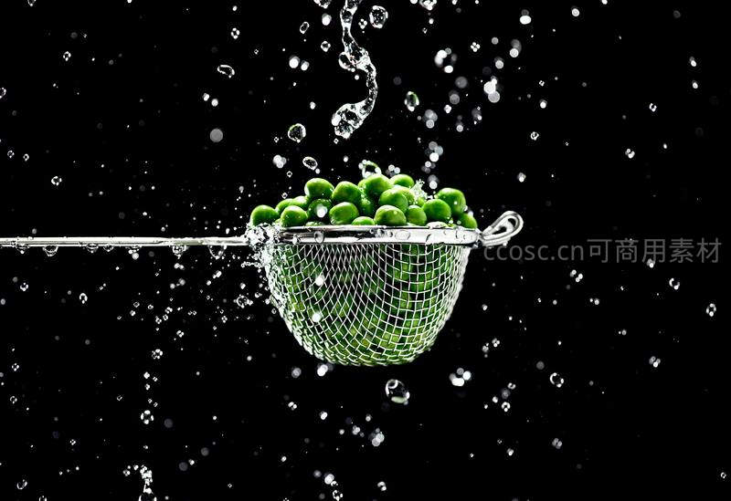 一把金属漏勺盛满翠绿青豆,水流冲刷溅起水花,黑色背景突出食材的新鲜与活力,充满厨房生活的动感。