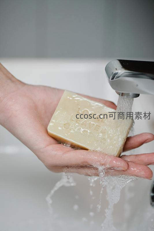 手中香皂被水流冲洗,泡沫轻柔弥漫