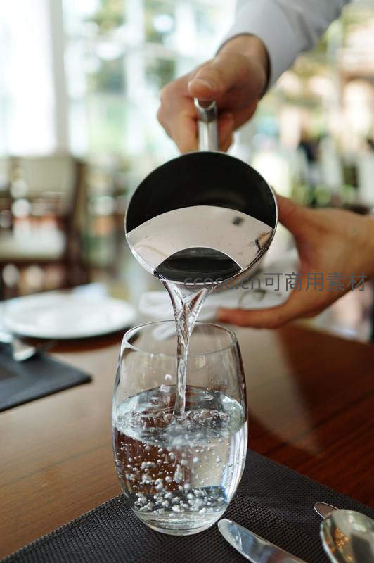 餐厅内,服务员正用金属水壶为客人倒水,水流注入玻璃杯,气泡升腾,背景虚化,体现专业与精致的服务体验。