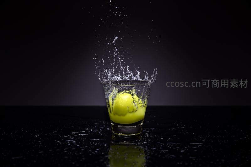 柠檬落入玻璃杯激溅的水花