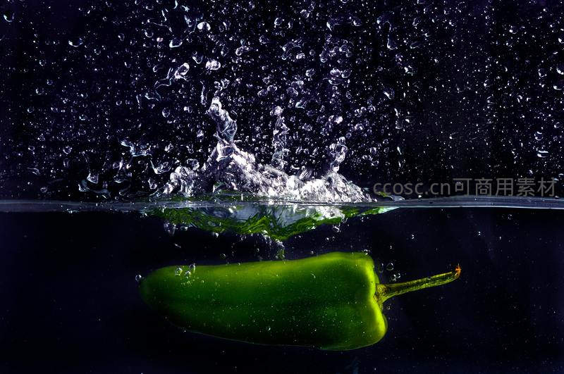 一颗鲜绿的青椒坠入水面,激起晶莹水花,深色背景下凸显其活力与新鲜感,充满视觉冲击力。