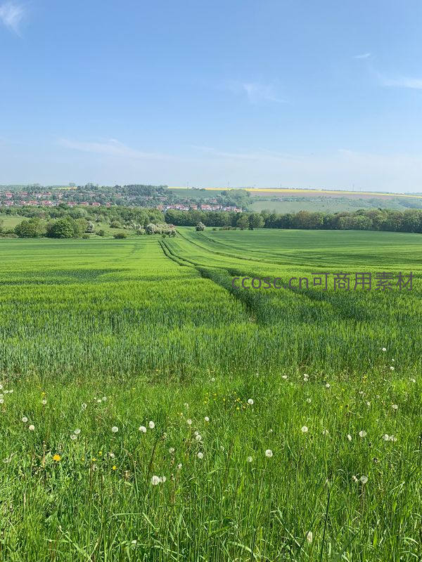 一望无际的翠绿麦田在阳光下生机勃勃,田间小路蜿蜒向前,远处是掩映在绿树中的村庄,前景点缀着蒲公英,充满春日气息。