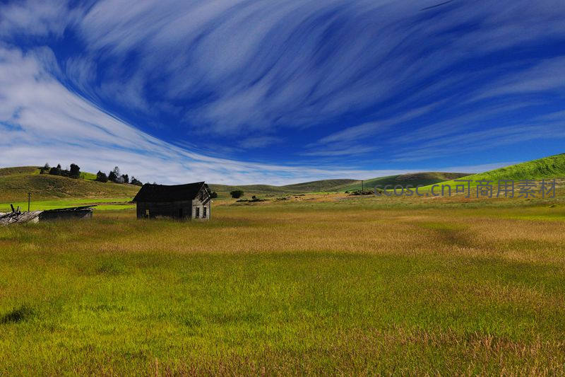 一座孤寂小屋静立于广阔草甸,头顶是如丝如缕的梦幻流云,营造出超现实的宁静氛围。