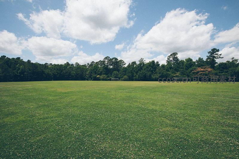 一片开阔的绿色足球场延伸至茂密森林边缘,晴空万里,是运动与自然完美结合的理想场所。
