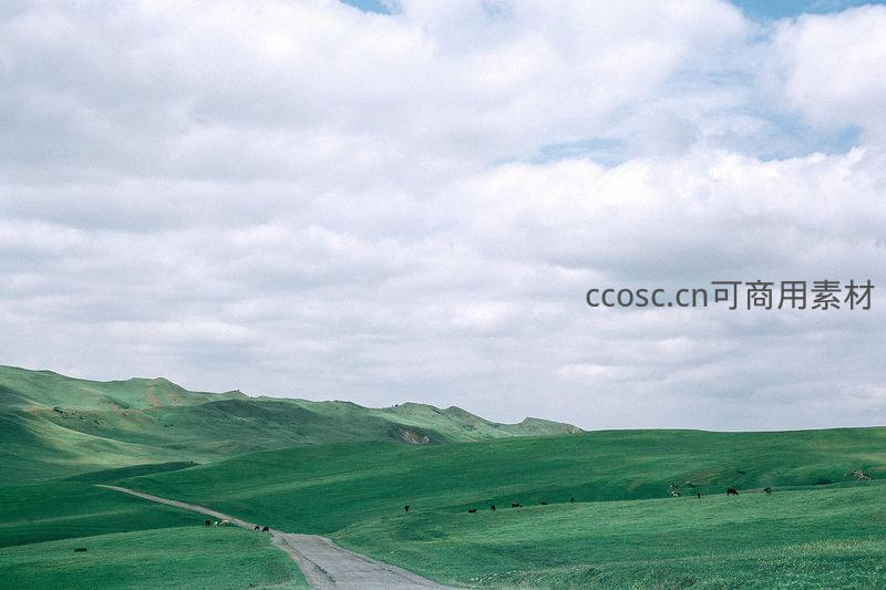 一条土路蜿蜒穿过无垠的绿色草原,远处山丘起伏,几头牛悠闲吃草,白云朵朵,充满诗意的田园风光。