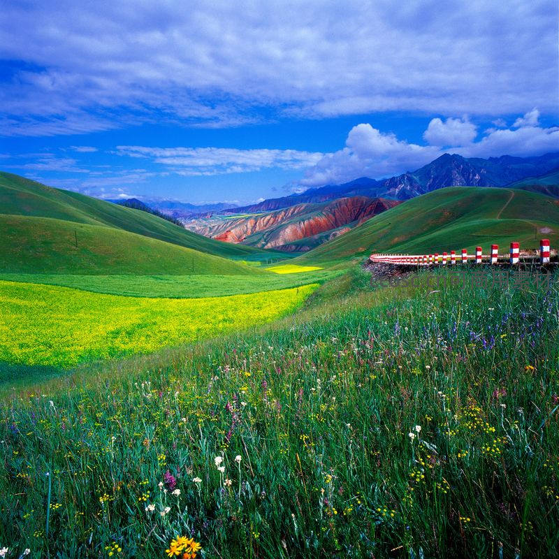 绿野花海与远山云影的壮丽画卷