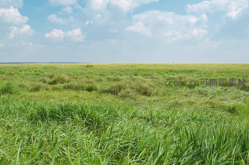 无边无际的绿色草甸在微风中轻轻摇曳,远处地平线与蓝天相接,云朵悠闲飘浮,呈现出原始、宁静且充满生命力的湿地草原风光。
