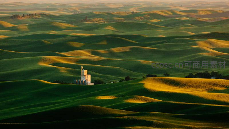 金色阳光洒满如海浪般起伏的广阔田野,一座孤寂的粮仓静立其中,光影交错间尽显大地的壮丽与农业的丰饶。