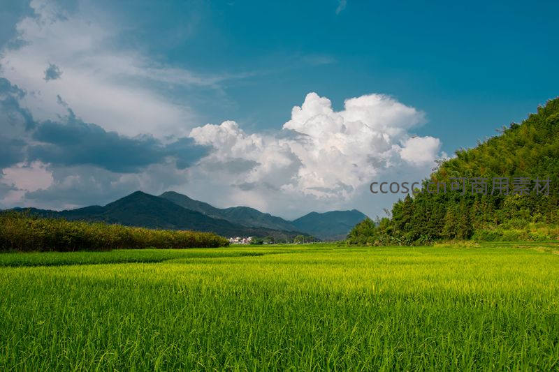 稻浪翻涌:青山环抱下碧绿稻田与风云变幻