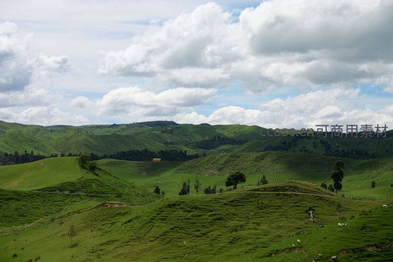 云端牧场:绿意盎然的丘陵与散落的农舍羊群