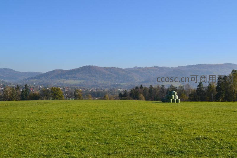 远山如黛:晴空下绿野与草垛堆叠的田园诗篇