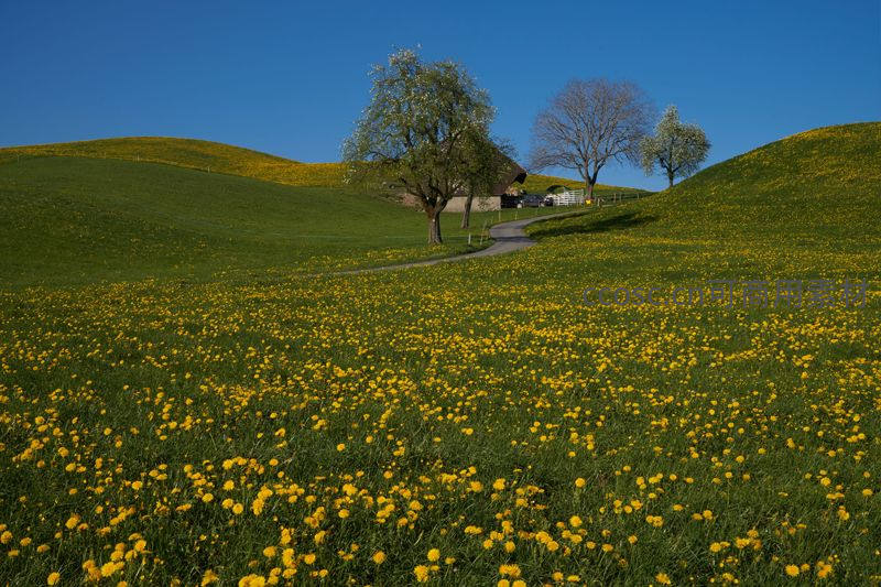 金黄蒲公英覆坡地,蜿蜒小径通幽处