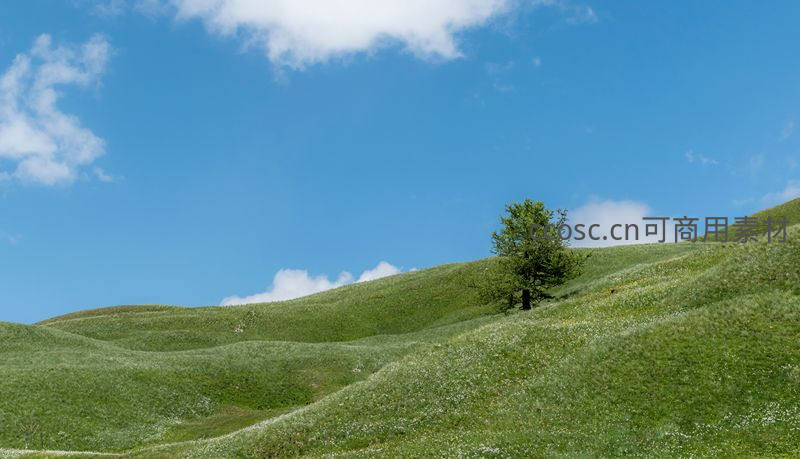 翠绿的起伏草坡上,一棵孤树静静伫立,头顶是万里无云的湛蓝天空,构成一幅宁静而壮阔的自然画卷。