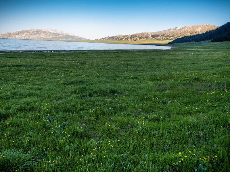 平静的湖水与无垠的绿茵草原相接,远处连绵的山脉在晨光中若隐若现,近处野花星星点点,尽显自然宁静之美。