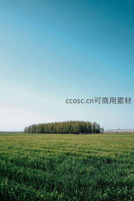 一片广袤的绿色田野延伸至远方,一排整齐的树林如屏障般矗立,天空湛蓝无垠,营造出宁静而开阔的田园景象。