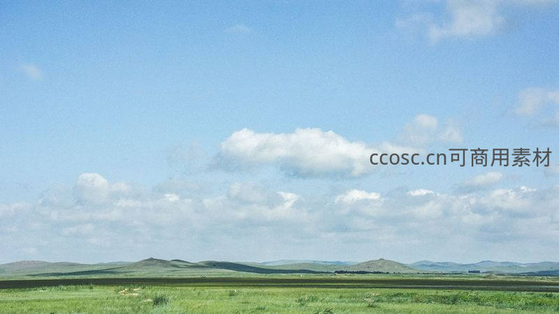 无垠草原铺展至天边,朵朵白云悠然飘浮于蔚蓝天空,远处起伏山峦勾勒地平线,尽显大自然的辽阔与纯净。