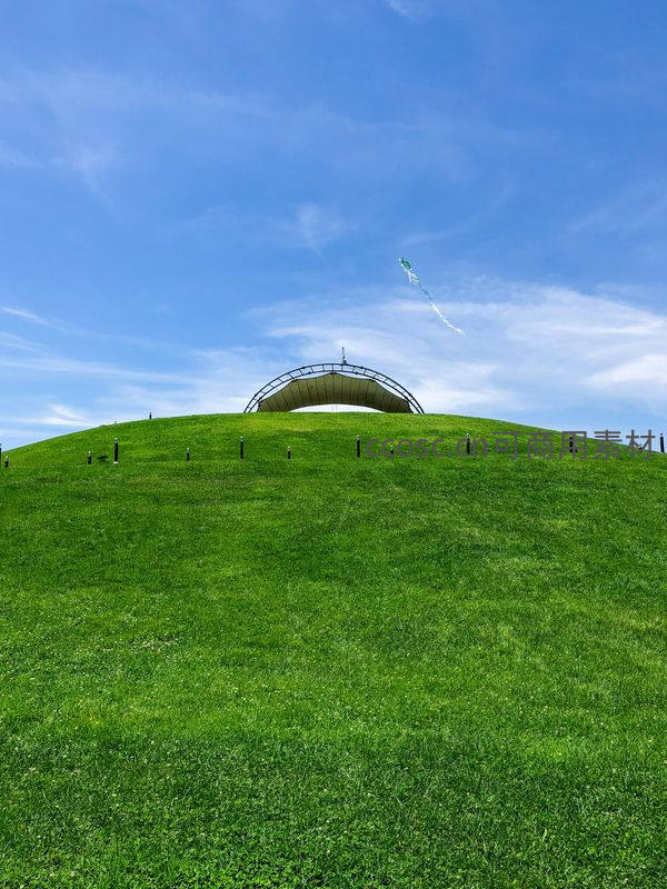 一座现代风格的拱形凉亭矗立在翠绿山丘之巅,蔚蓝天空中飘着一只风筝,充满悠闲度假氛围。