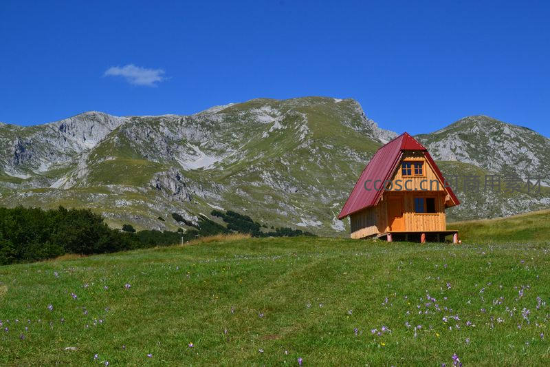 一座红色屋顶的木质小屋孤傲地伫立在开满野花的高山草甸上,背后是巍峨的岩石山脉和湛蓝天空,如童话般静谧美好。