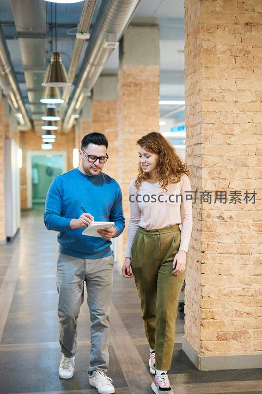 一男一女在工业风办公走廊中边走边讨论工作,男士手持笔记本记录要点,体现灵活高效的沟通方式。