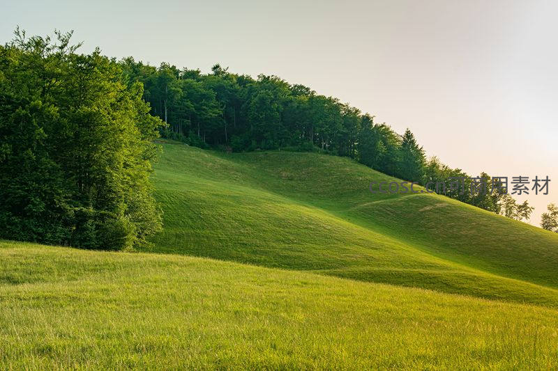 金色夕阳温柔地洒在起伏的绿色山坡上,边缘的茂密树林投下深色剪影,构成一幅宁静而富有层次感的自然画卷。