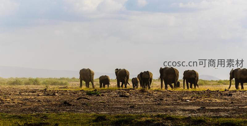 一群大象在辽阔的非洲草原上缓缓行走,背景是连绵的山丘和多云的天空,展现了野生动物的壮丽与宁静。