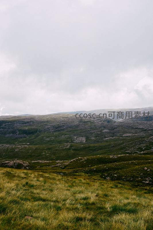 灰白云层笼罩着连绵起伏的山丘,山坡上覆盖着稀疏的草地与岩石,整体氛围静谧苍茫,仿佛置身于无人之境。