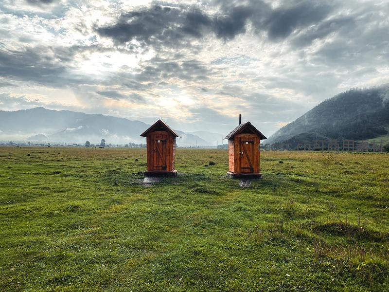 薄雾笼罩的清晨草原上,两座古朴木屋静静伫立,远处山峦若隐若现,营造出诗意般的田园氛围。