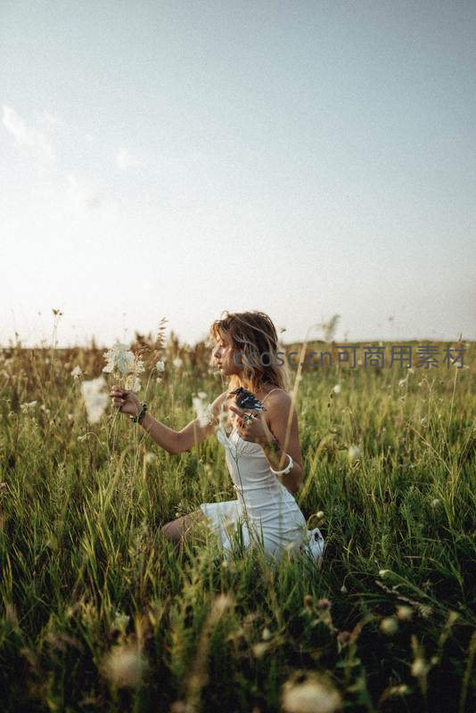一位身着白裙的女孩蹲坐在野花盛开的草地上,沐浴在温暖的夕阳余晖中,神情恬静,画面唯美动人。