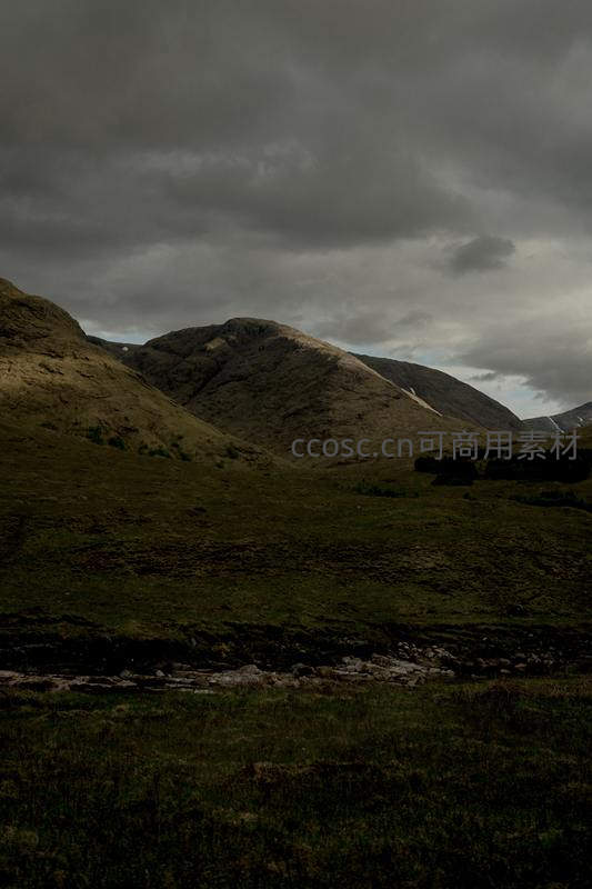 厚重的乌云低垂覆盖着起伏的山峦,山谷中一条小溪蜿蜒流淌,整体色调灰暗,营造出苍凉孤寂的自然氛围。