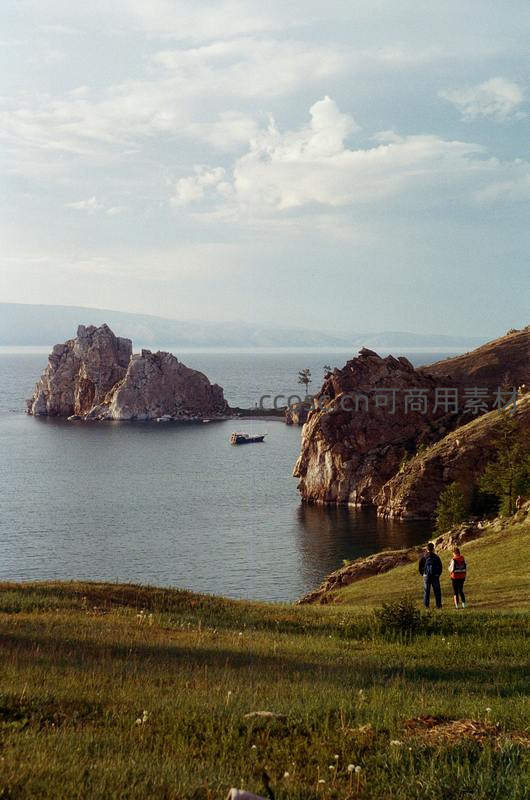 碧蓝湖水环绕着嶙峋巨岩,岸边两位游客静静伫立远望,远处小船漂浮,构成一幅人与自然和谐共处的诗意画卷。