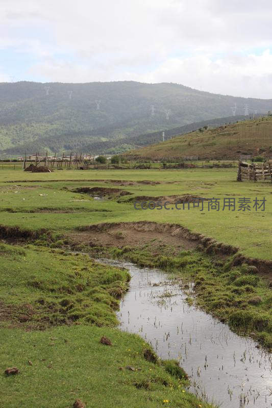 清澈的小溪在翠绿草地上曲折流淌,远处青山连绵,点缀着木栅栏和农舍,呈现出一派宁静祥和的田园牧歌景象。