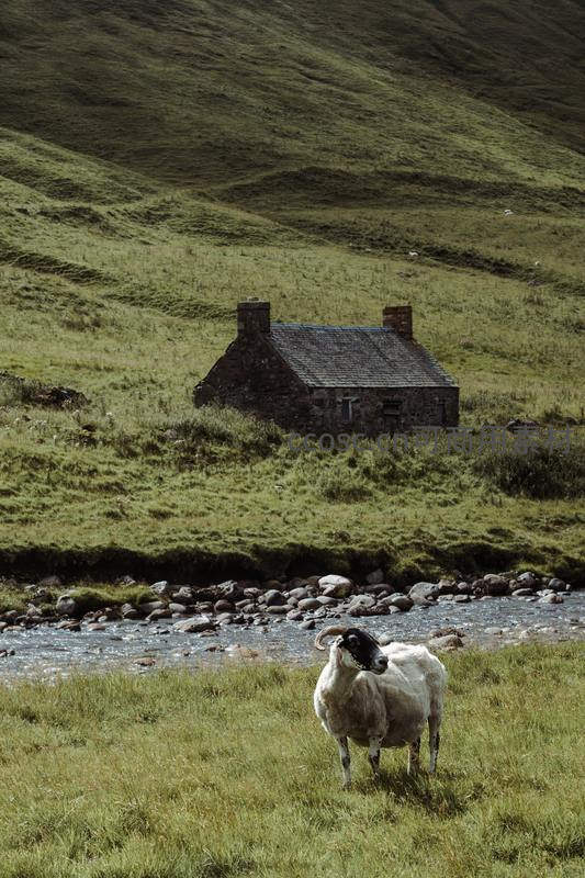 一只黑白相间的绵羊站在溪流旁的草地上,背景是一座古朴的石砌小屋和苍翠的山丘,整个场景散发着宁静祥和的田园气息。
