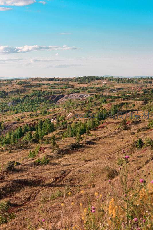 在晴朗的秋日,起伏的丘陵覆盖着干枯的草地和星星点点的野花,远处是茂密的树林和开阔的天空,展现出大地粗犷而多彩的纹理。