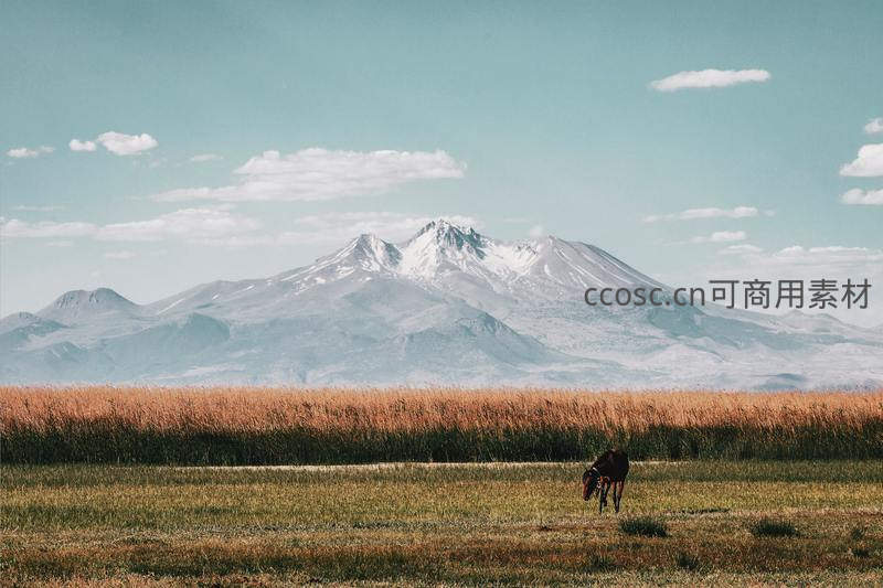 一匹棕色骏马在金黄的草地上低头觅食,背景是雄伟壮丽、白雪皑皑的连绵山脉,天空湛蓝,云卷云舒,意境悠远。