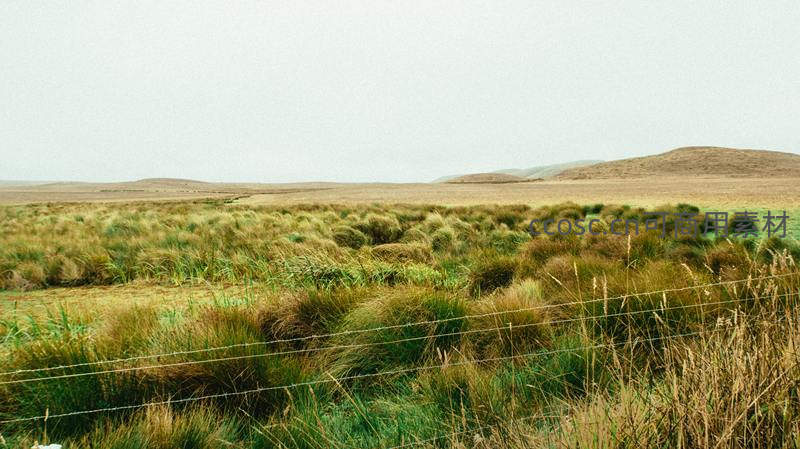 一片辽阔的草甸延伸至远方低矮丘陵,前景是锈迹斑斑的铁丝网,天空灰白,营造出一种苍凉而宁静的荒野氛围。
