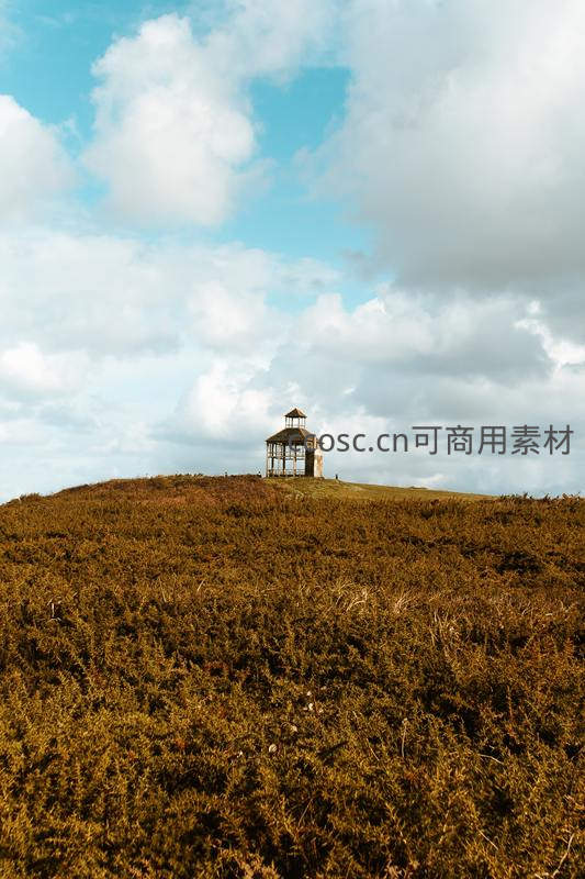一座古朴的木制凉亭独自矗立在覆盖着枯黄灌木的山巅,头顶是蓝天白云,仿佛置身云端,视野开阔,心境澄明。