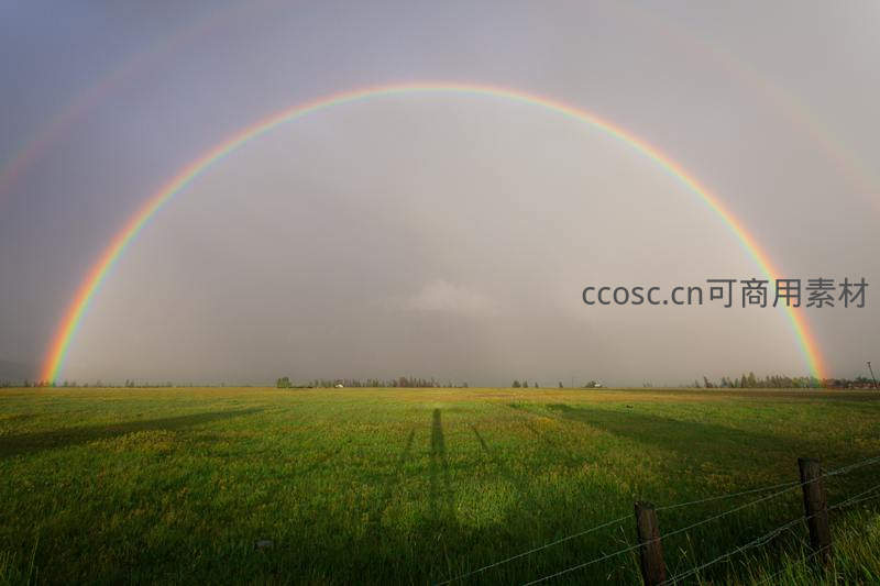 一场骤雨过后,一道绚丽的双彩虹横跨天际,映照在无垠的翠绿田野之上,带来希望与宁静的视觉盛宴。