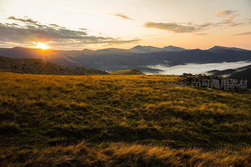 夕阳西下,金色光芒铺满山巅草原,远处云海翻腾,层峦叠嶂,构成一幅温暖而宏大的黄昏自然图景。
