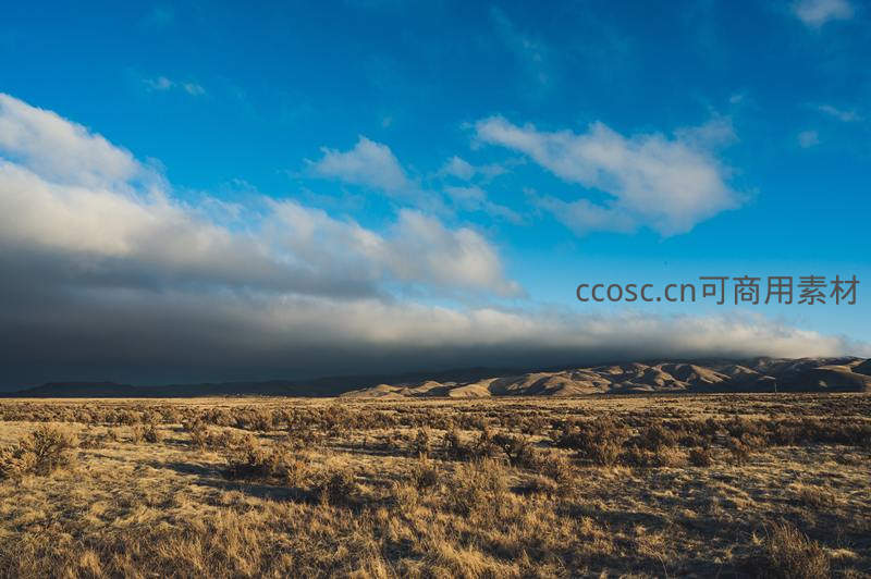 厚重的云层在晴朗的蓝天中投下斑驳的阴影,为起伏的草原和山丘增添了戏剧性的层次感。