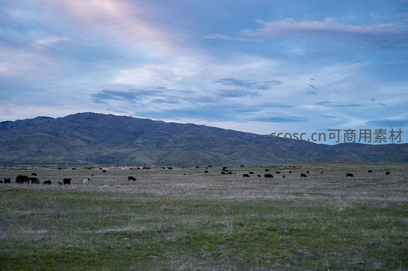 辽阔的草原上,成群的牛在悠闲吃草,远处连绵的山脉在暮色中若隐若现,天空云层变幻,构成一幅宁静的田园画卷。